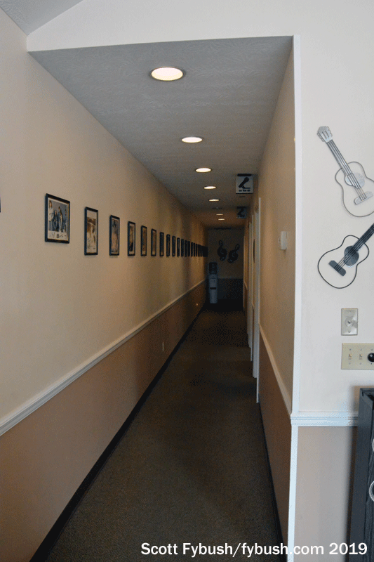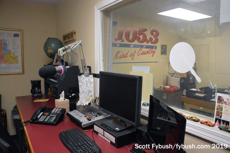 Under longtime owner D.R. Rice Broadcasting, WMPI has settled in nicely here. This is a classic smalltown studio setup: walk in the storefront and you’re looking right through a window behind the reception desk into the main air studio.