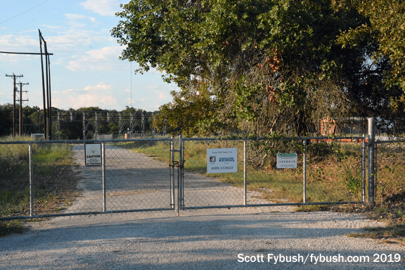 A newer cluster of towers sit to the north of the Tower Road sites: closest to the Texas Tall Tower, and easily seen from its gate, is the tower that’s home to Univision’s KWEX (Channel 41), one of the oldest Spanish-language TV stations in the US, as well as to several FMs: KROM (92.9) and KVBH (107.5) are Univision sister stations to KWEX, while KISS-FM (99.5) and KSMG (105.3) are Cox stations that are tenants.