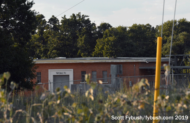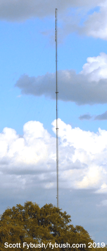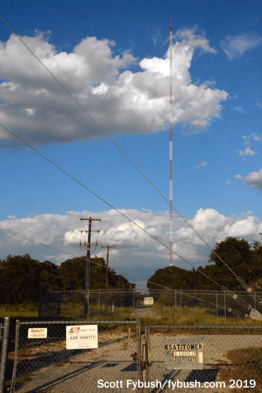 As we’ll see later in our San Antonio visit, WOAI’s AM station is long gone from here (though we’d later learn that we’d driven right by a short tower here that can still serve as an emergency WOAI aux site). The original Texas Tall Tower, some 1350 feet, has been replaced by a newer version for digital TV, just over 1500 feet tall, still carrying the stacked antennas for WOAI and KENS. (And we wonder: did the “WOAI-TV” callsign stay on the building for all the years, from 1974 until 2002, when channel 4 had changed calls to KMOL?)