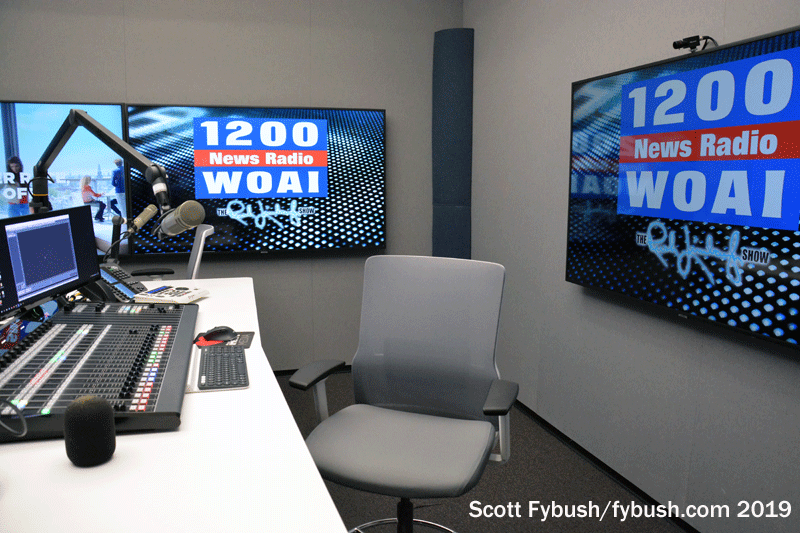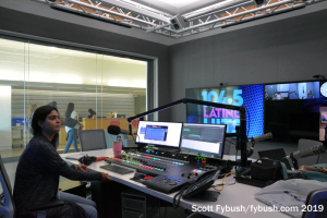 There’s a showcase studio right off the lobby where each station puts its most prominent shows: the WOAI morning show, KTKR’s late-morning sports talk, “Latino Hits” in the early afternoon and so on, with the digital signage on the walls changing for each station and the Wheatstone consoles seamlessly reconfiguring as each station takes over.