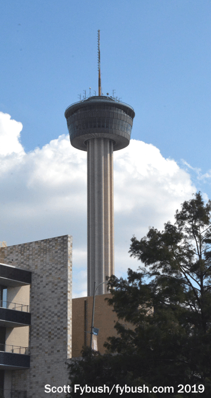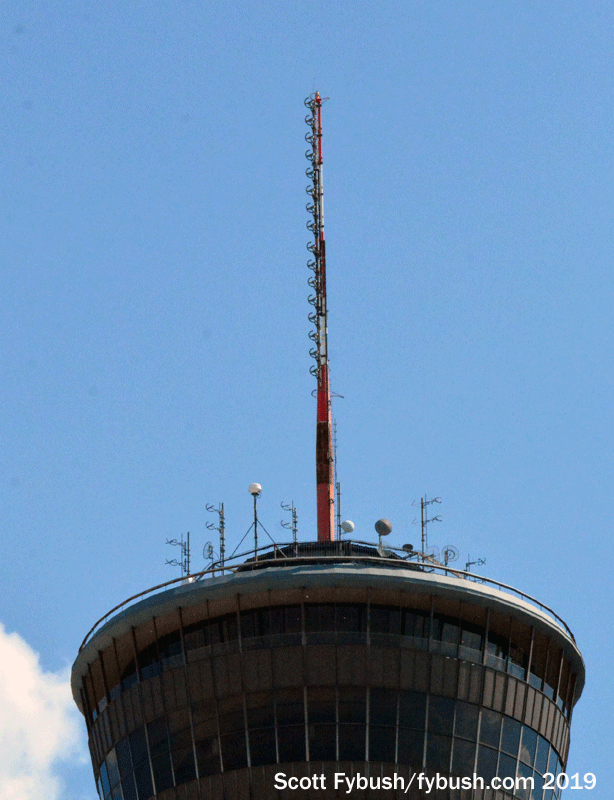 And just a couple of blocks to the south, there’s the 750-foot Tower of the Americas, the most visible relic of the 1968 Hemisfair. Within a couple of years after the fair’s end, this prominent concrete pillar with its observation deck and revolving restaurant had taken on FM tenants, eventually ending up with three of them: today’s KQXT (101.9), KJXK (102.7) and KZEP (104.5).