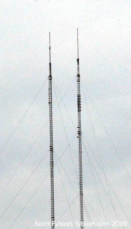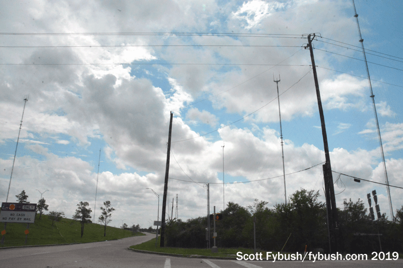 That original KTRK tower site still exists (and yet we somehow didn’t get any good pictures of it), a little to the east of the rest of the tower farm. In the early 1980s, it was replaced by two towers at what’s now called “Teletower,” and it has lots of new antennas and nearby company: this pair of 1800-footers is home not only to KTRK, now an ABC O&O outlet, but also to Fox’s KRIV (Channel 26, formerly on One Shell Plaza downtown), to KUHT/KUHF (for now), to iHeart’s KQBT (93.7) and to Radio One’s KMJQ (102.1).