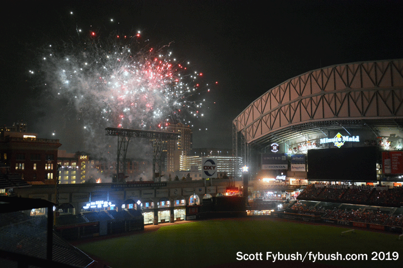 The Astros prevailed over the As in this late-season game, and the roof opened (after some technical delays) for fireworks over downtown Houston.
