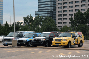 From here, we headed back to our car at the Entercom studios, passing by the row of iHeart promo vehicles out on the parking deck here, and then waving hello to the Univision studio building that’s prominent right by the 610/Southwest Freeway interchange.