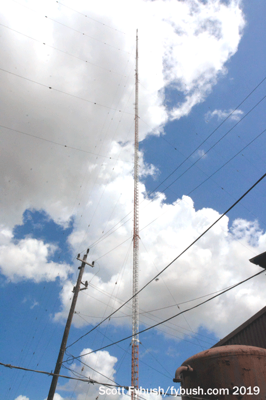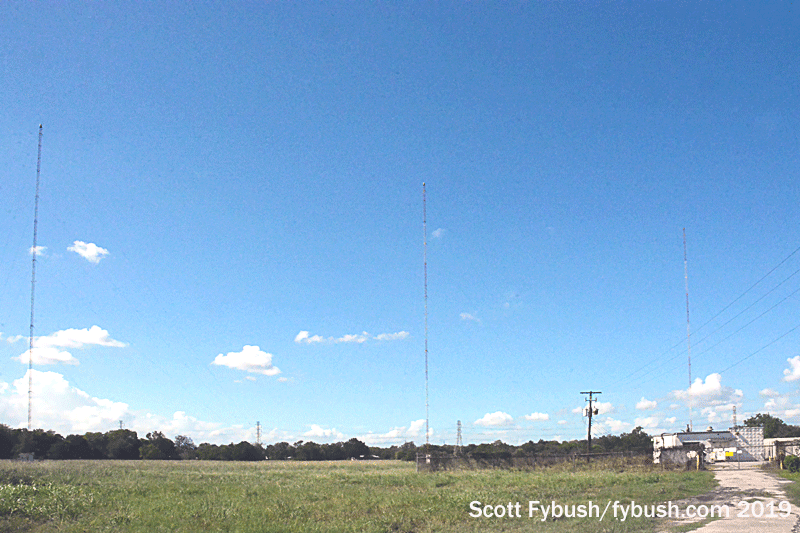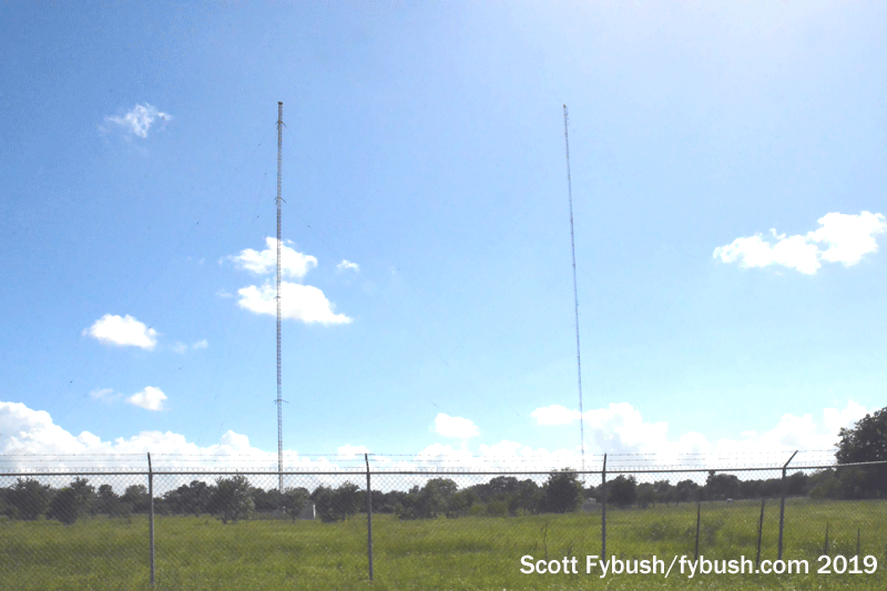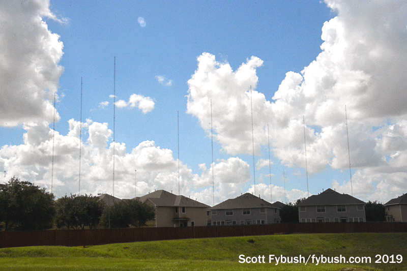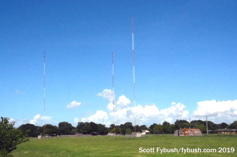 Hop on the beltway, head south across Buffalo Bayou and then east on the Pasadena Freeway, and you’ll arrive in Pasadena, the big suburb southeast of Houston. There’s lots of broadcast history specific to Pasadena, going back to 1950 and the debut of KLVL on 1480. The address has changed a few times over the years, but the site on Pasadena Boulevard, Quonset hut and all, hasn’t – these three towers have carried KLVL in a variety of formats, most recently leased-time ethnic, for 70 years now. (The tall tower also carried the old KLVL-FM 92.5, which eventually became today’s KKBQ 92.9, still licensed to Pasadena but transmitting from Missouri City with the other big Houston FMs.)