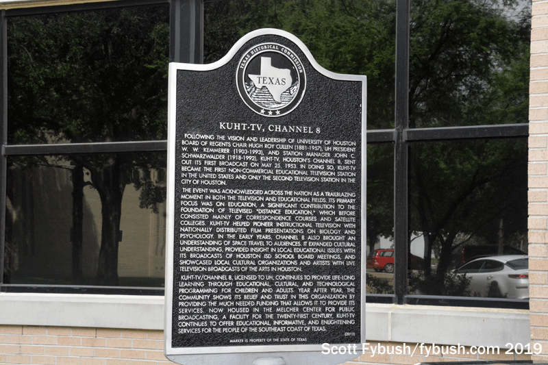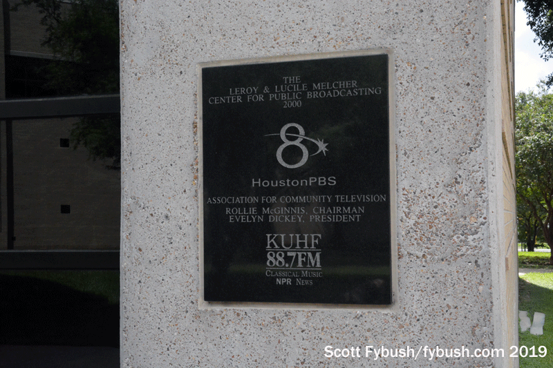 The history moved with KUHT: there’s a plaque here at the newer building marking channel 8’s place in educational TV history, as well as a marker for the 2000 dedication of this facility, the Leroy and Lucile Melcher Center for Public Broadcasting.