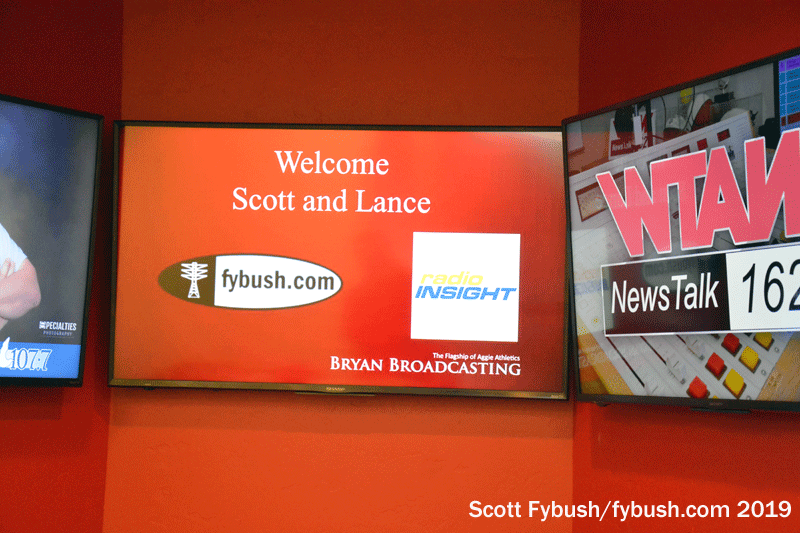 The Bryan Broadcasting cluster sits on the top floor of a bank office building on the frontage road along Texas 6, the freeway that bypasses the east side of College Station and Bryan (and eventually becomes the road that leads west to Waco, should you be headed that way.)