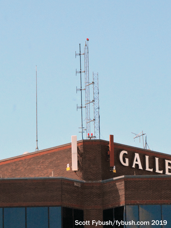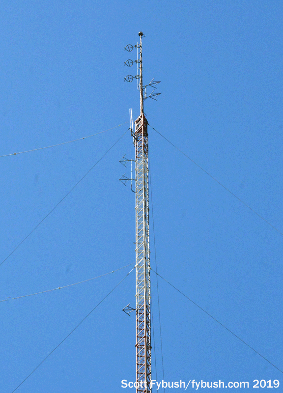 This is also where the iHeart cluster in town has its studio and some of its transmitters. The original Clear Channel actually owned KORA and KTAM for a while in the 1980s and 1990s, and then began assembling a new cluster here in the early 2000s. Classic rock KNFX (99.5 Bryan) has its main transmitter right here on the roof, next to aux transmitters for the other three FMs in the cluster: country “Aggie 96” KAGG (96.1 Madisonville), top-40 “Kiss” KVJM (103.1 Hearne) and AC “Mix” KKYS (104.7 Bryan). (Our friends from KHCB in Houston also have a 101.3 translator up here, fed by KALD 91.9 in nearby Caldwell; this was actually their very first translator as they began their big expansion a few decades ago.)