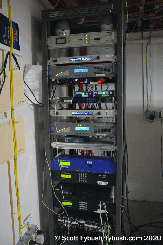 The “rack room” sat right next to the row of automation – EAS boxes, processing, studio-transmitter links, streaming, and an auxiliary transmitter to keep 94.7 on the air in the event its main site over in southern Steuben County lost power. (There was a one-bay antenna up on the roof for that purpose; it wouldn’t have covered much beyond Horseheads and Elmira Heights, but that’s better than being completely off the air, right?)