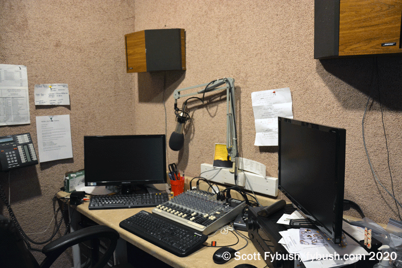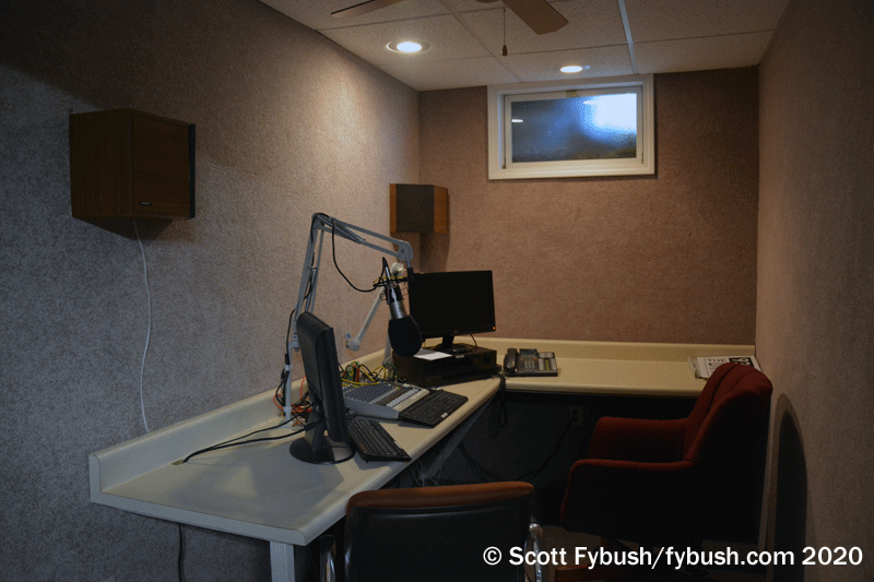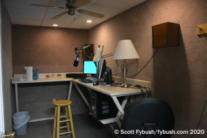 At least in recent years, most of the talent heard on the Met and Cool was voicetracked, either from Equinox’s other cluster over in Binghamton or from several small studios here on Chemung Street. There wasn’t much to see here – just small boards feeding into the RCS Zetta automation that powered the stations, all of which lived in a set of computers and monitors just outside the studios downstairs.
