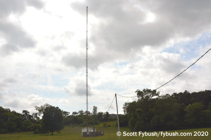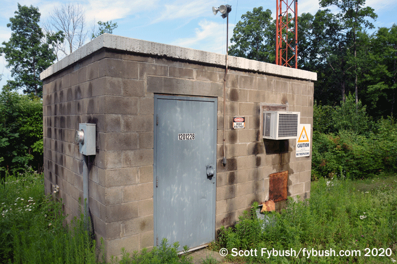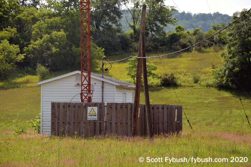 A compact block building holds the McMartin transmitter and a rack of equipment, and there’s a four-bay antenna on the guyed tower out back, and that’s basically all there is to this simple site, which is up at a nice elevation that sends its signal westward as far as Elmira and eastward into Owego.