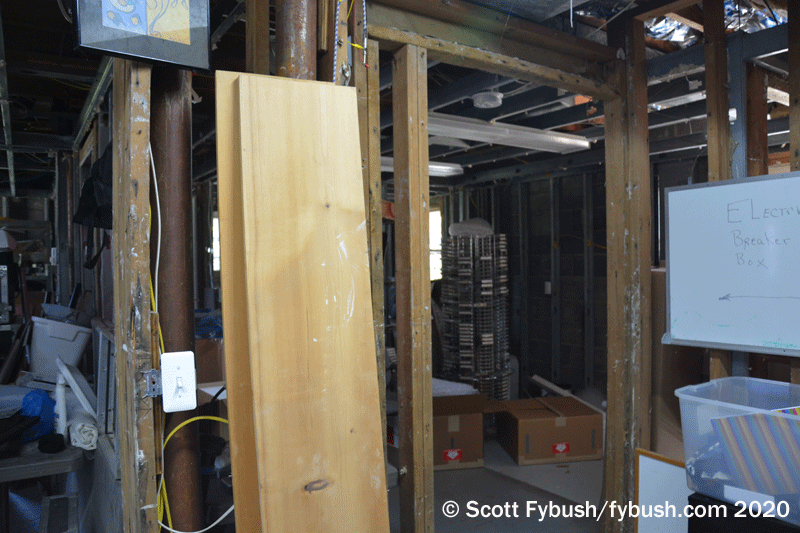 Here in the split-level house that’s home to WGHT, you can see the results on the lowest level, down the stairs to the left of the lobby. There were once studios down here (and I think the transmitter may have been here, too), but after one too many floods, the walls were ripped out and everything was moved upstairs.