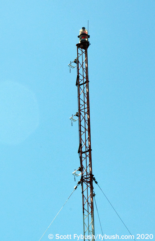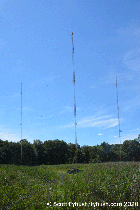 And out back, the three towers sit in the swamp, with the new translator antenna prominently mounted on the center tower.