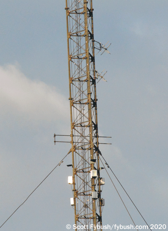 At WUTV’s site, there’s a “goalpost” atop the tower, now carrying the two post-repack antennas for the stations. The shorter one on the left is WNYO’s RF 16, which has become the ATSC 3.0 host station for the Buffalo market; on the right is WUTV’s ATSC 1.0, now on RF 32.