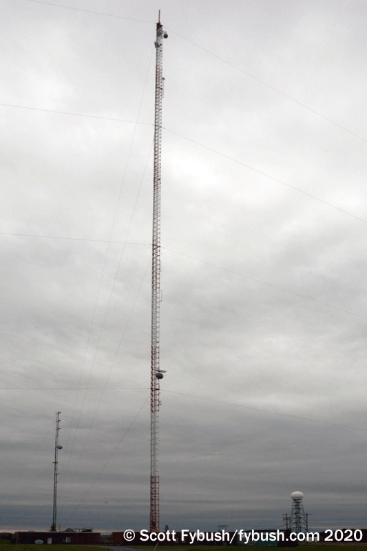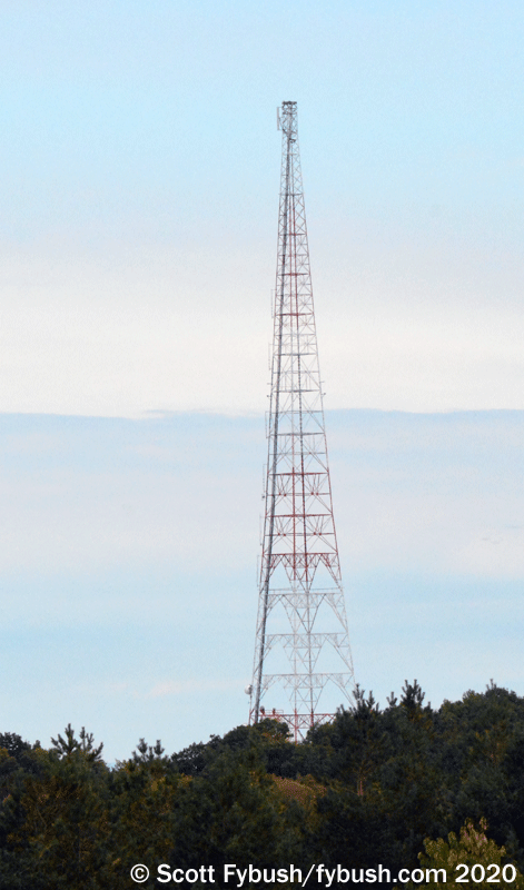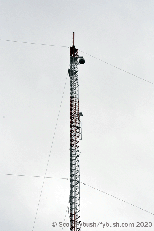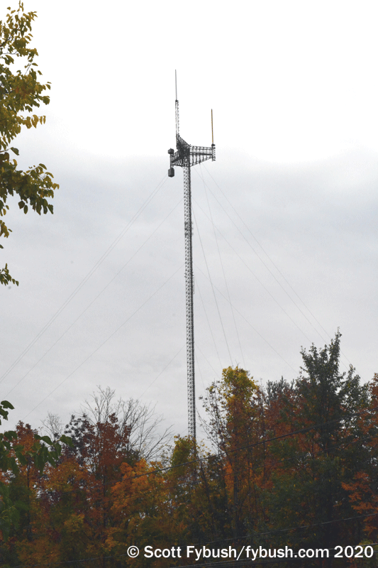 The other original tenant here on the candelabra is the public TV station in town, WCNY-TV (Channel 24), now on RF channel 20 and sharing an antenna with WSTM. WCNY’s FM sister station, WCNY-FM (91.3), stayed put at WCNY’s old location to the east in Pompey after the TV moved – we’ll see that in a moment – but holds a construction permit to move to the candelabra site on a new panel antenna, which was already up on the tower last year.