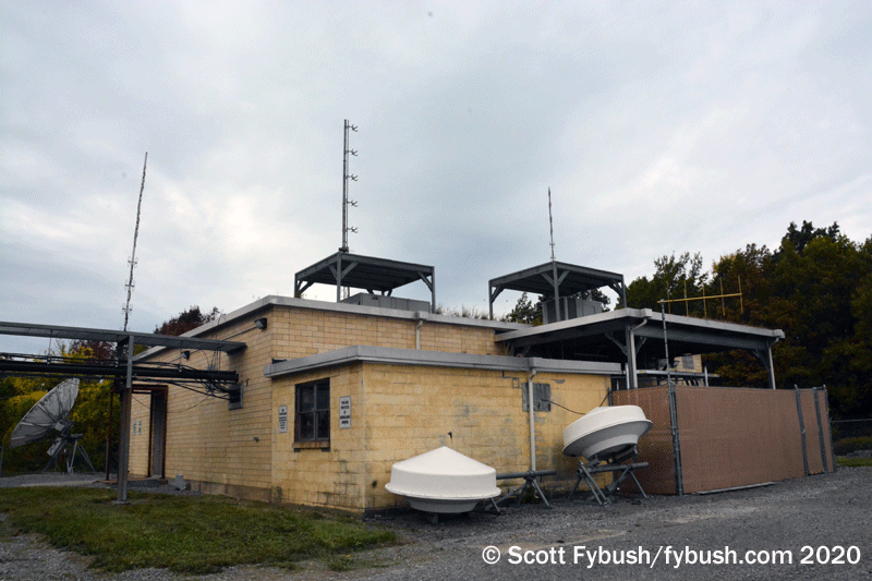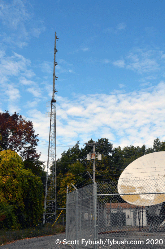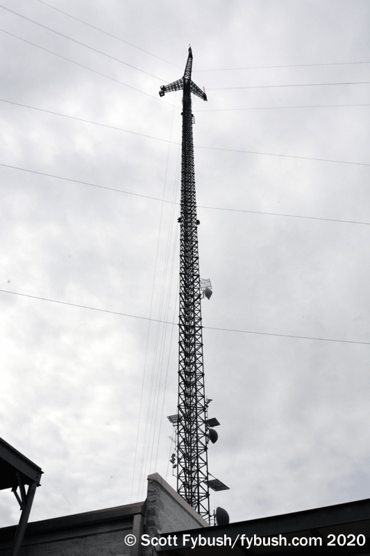 Long ago, WSTM was WSYR-TV, and its sister FM station, WSYR-FM (94.5), operated from a short tower here. The FM station is now owned by iHeart as WYYY, still using the short tower with a grandfathered 100 kW signal – and now its transmitter once again shares space with WSTM. (For a few years after WSTM moved into the new building, WYYY stayed put in the original 1950s-vintage building just across the parking lot, but that structure has now been demolished.)