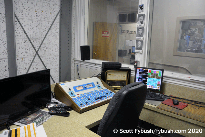 There are two clusters of studios here: in back is the studio used for WRRN and another that was the AM control room, with a rack of equipment for STLs and such (was this once where the early FM studio and transmitter once sat?), while in front is another big room that serves as the 104.3 studio, with an even bigger room facing Second Avenue that’s used now for production, all filled with decades of memorabilia and signage and other fun old stuff.