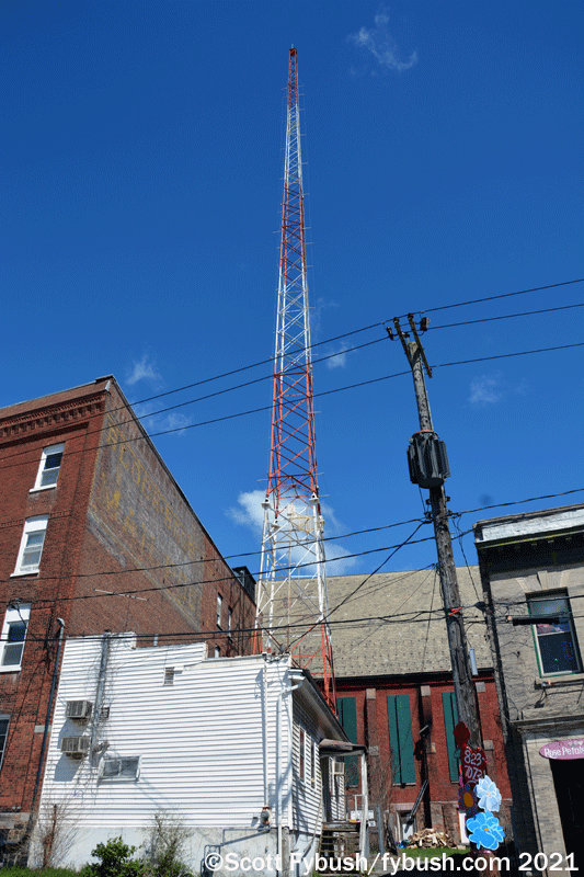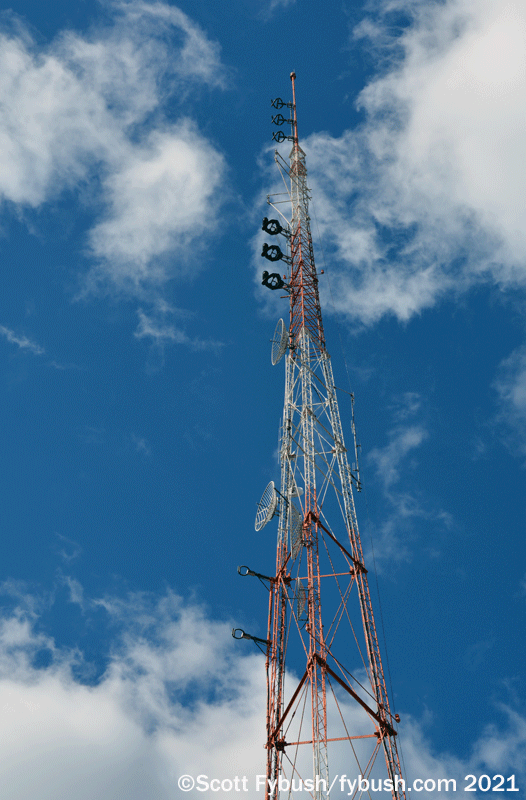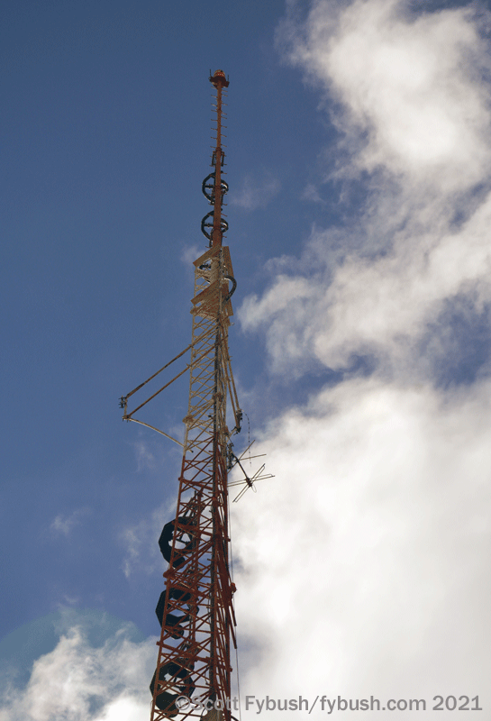 On the right as you get to the top of Smith Hill is the longtime studio and former transmitter site of Utica’s NBC affiliate, WKTV (Channel 2), and we stop to get a quick shot of the new antenna here for W22DO-D (Channel 22), the Utica translator for Syracuse PBS station WCNY. (This tower is also home to WUNY 89.5, which simulcasts classical WCNY-FM 91.3 from Syracuse, and to commercial classic rocker WXUR 92.7.)