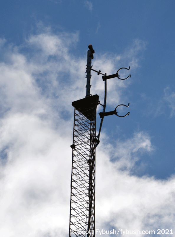 Across the road is the tower of Townsquare’s WLZW (98.7) and WODZ (96.1) – but we’re here to take a careful look around the side for a little antenna between the two big sets of FM bays. W231DZ (94.1) went on the air here in early 2020, relaying WRCK (1480 Remsen) – and since Fybush Media did the engineering for the FCC application in the 2018 translator window, we were excited to see the results. (This 79-watt signal gets out very well up here, we’re proud to say…)
