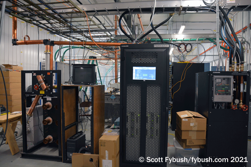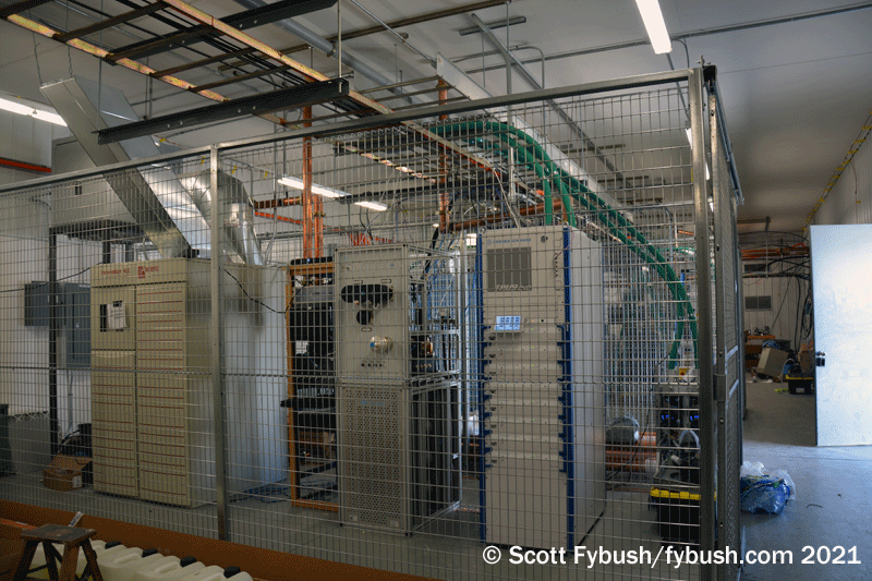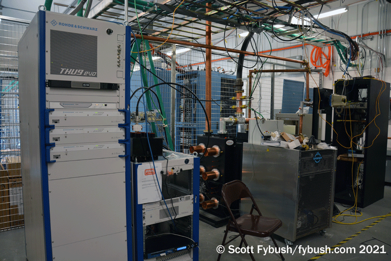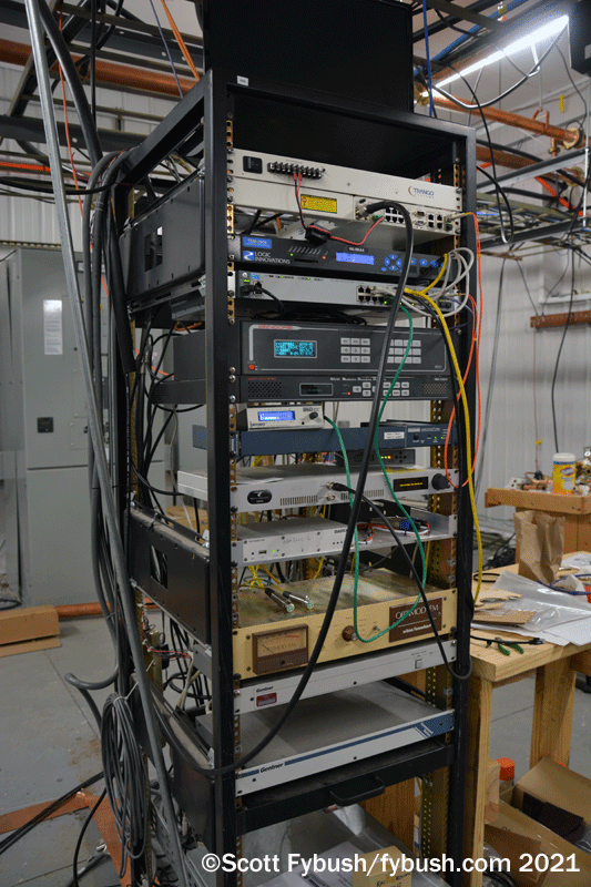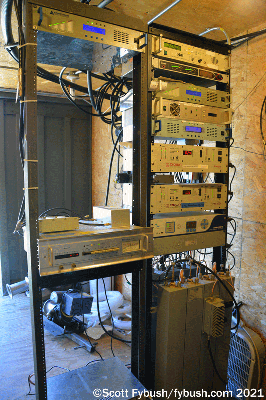 There’s one translator that’s not in this container or on the shorter tower. Moving over to the newer prefab TV building next door (which was a considerable project to get built, what with all the heavy equipment that had to get hauled up the hill), we find one rack of radio gear amidst the DTV transmitters. W214AA (90.7) signed on up here in 1998 from a much shorter tower, carrying the secondary news-and-jazz program feed from Binghamton public broadcaster WSKG (via its WSQX 91.5 Binghamton), then relocated to a spot near the top of the 800-foot tower once it went up.