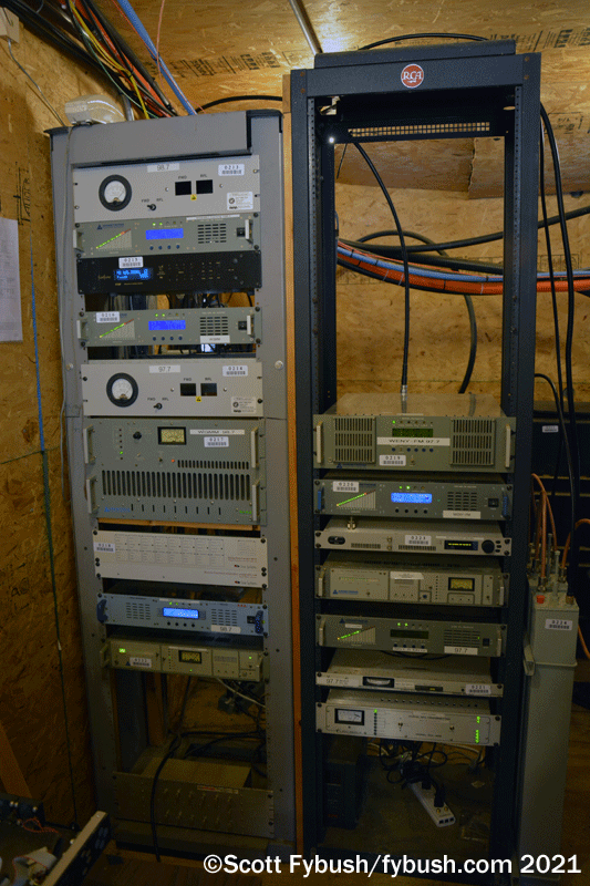 The 97.7 and 98.7 stations are still here, at the back of the container, but they were in the midst of some big changes in the spring, transitioning from their former Sound Communications ownership to Seven Mountains, which in turn was selling 97.7 to Family Life, the regional Christian broadcaster that’s building a new headquarters down the hill in Corning. That meant call and format changes: 97.7, which had become WENY-FM with a “Magic” hot AC format, became Family Life’s WCIG a few months after this visit; 98.7, which was WGMM with a quirky classic hits format, became “Cool” WPHD with a more mainstream oldies/classic hits format.