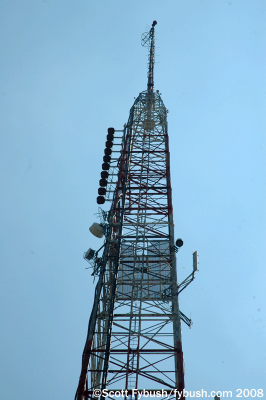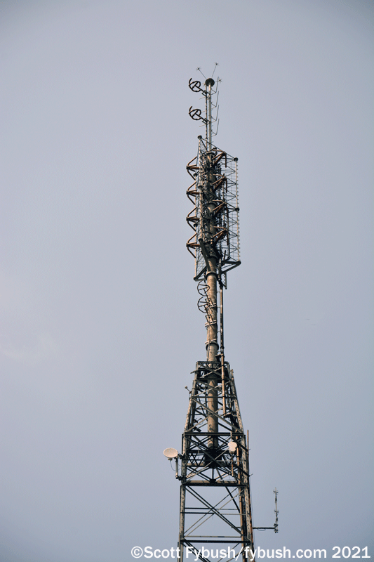 We’d visited here before, back in 2008, when we got what turned out to be a not-great angle of the complex mess atop the tower. A bit of history (of course): this tower was built in 1947 for WMAL-TV (Channel 7), which also installed WMAL-FM (107.3) here. In the early 1960s, American built a new communications building in front of the transmitter building and put its own FM station, WAMU (88.5), on the air from the tower.