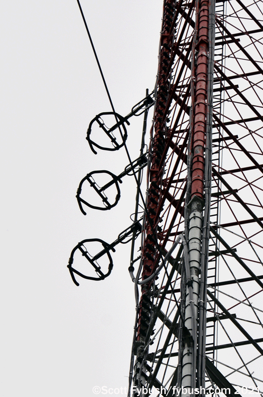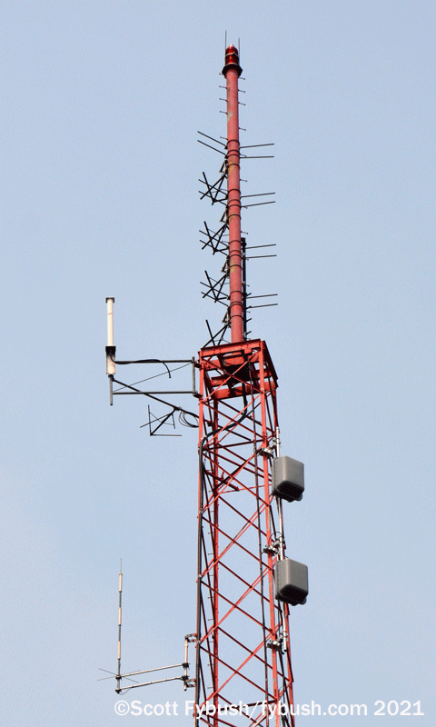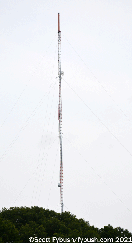 It quickly gained an FM tenant, too: Community Broadcasters’ WBDR (106.7 the Border) is licensed to Copenhagen, serving Watertown from a class C3 facility just under the WWTI RF 31 antenna. (The old analog 50 was top-mounted, and is gone now.)