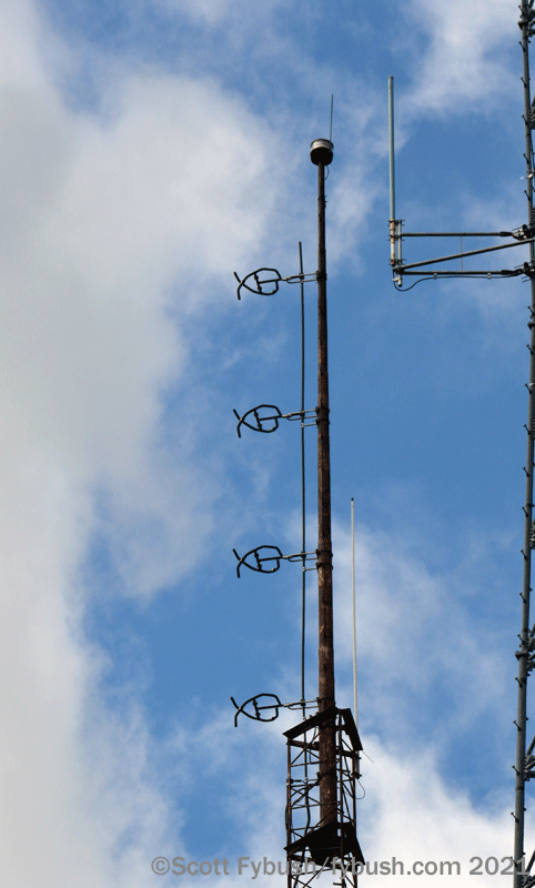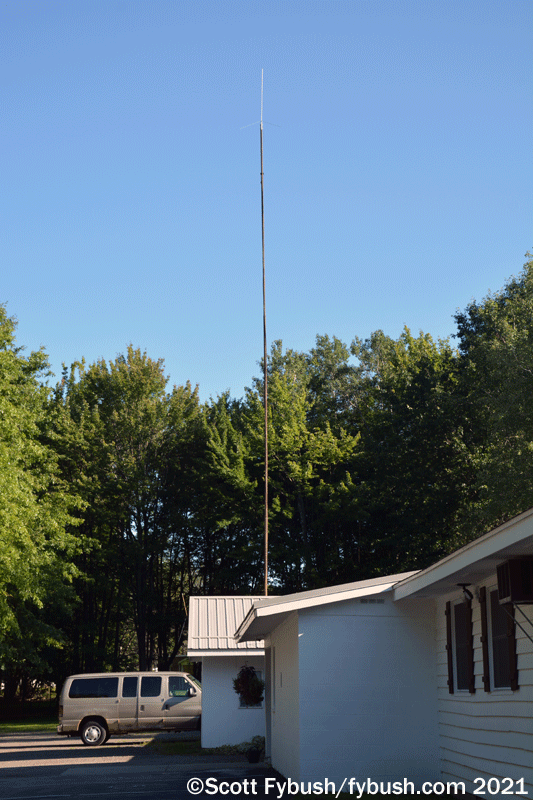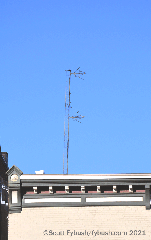 Coming into downtown, look up as you cross the river – a block away from the Comedy Center, the old Jamestown Furniture Exhibition warehouse has cell antennas on its roof and the two-bay antenna of WIHR-LP (94.1), another religious signal that wasn’t on the air during this visit.