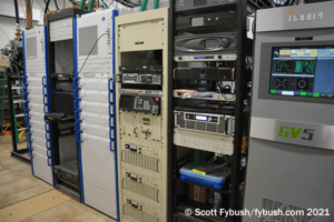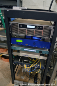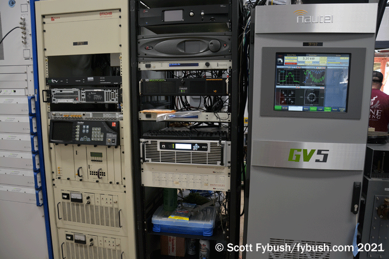 There’s a radio tenant here, too: religious broadcaster WCTL (106.3) moved north from Union City a few years ago to operate in HD from a panel antenna partway down on the big tower. WCTL’s HD2 carries a talk format, which operates on two translators, including 105.9 here at the WSEE site and a 103.3 signal to the south that’s tied in to AM station WZTL (1530 Union City). That’s WCTL itself on the Nautel GV5 and the 105.9 translator in the rack to the left.