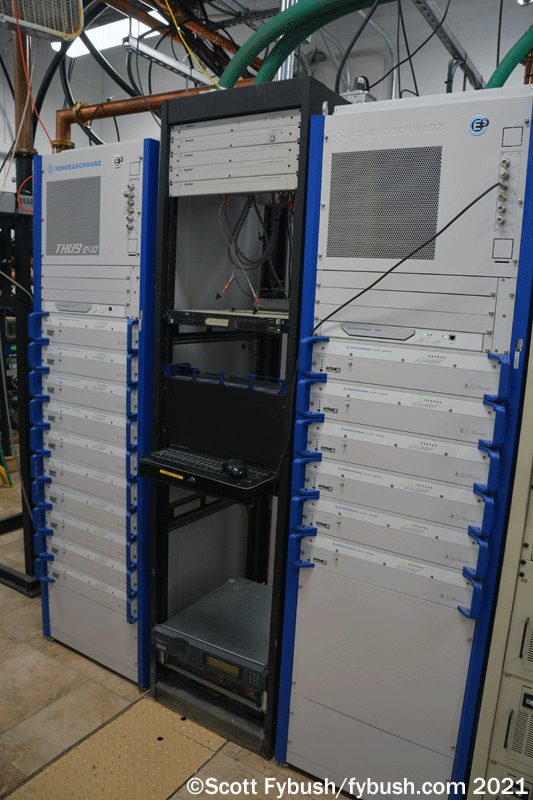 All the transmitters are neatly packed in to the back room here, mostly lined up along one central row. There’s a pair of Rohde & Schwarz transmitters for the two Lilly stations, WSEE on RF 21 and WICU on RF 12. This site had also been used by a low-power DTV station, the now-defunct WLEP-LD (Channel 9/RF 43) before its spectrum was sold, and I think that’s what that rack in the middle was.