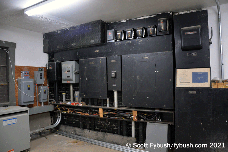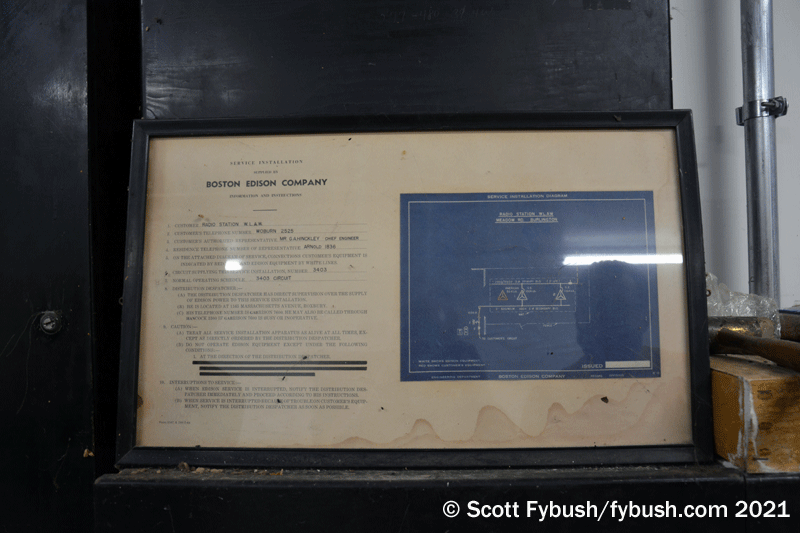 Go around behind the Nautel and the DX10 and there’s space that once held modulation transformers for older transmitters here – and behind it, an electrical room that still looks much like it did in 1948, complete with an original Boston Edison blueprint showing the four-digit phone number this then-rural site had. (Today, it backs up close to the bustling Burlington Mall and the retail and industrial sprawl that surrounds it.)