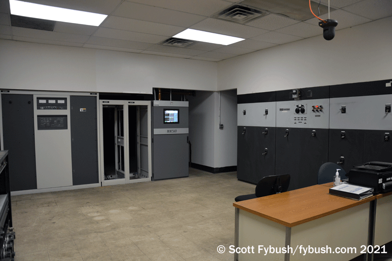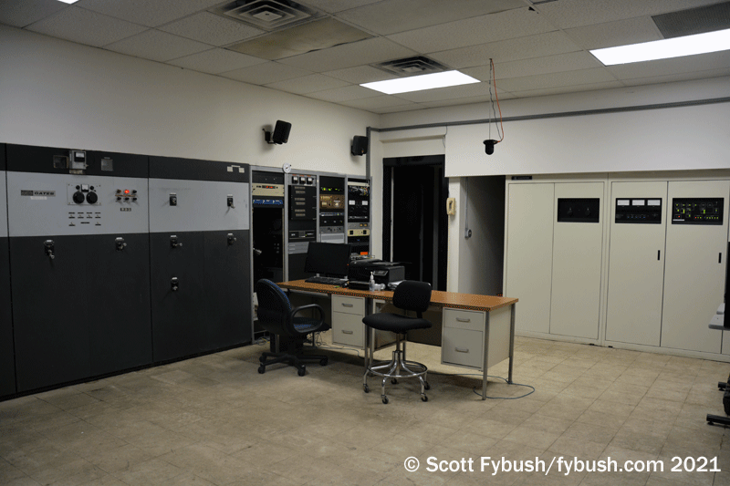 And what’s that to the left of the Nautel? It’s a DX10, and it’s not presently connected to anything – but when WBZ left its studios on Soldiers Field Road in 2018, it lost its longtime auxiliary transmitter site at the studio building there (still used by WBZ-TV) not long afterward when the auxiliary AM tower was demolished in preparation for new development in the old parking lot there. So the DX10 from that site, barely used since it was installed in 2013 to replace an earlier unit, was moved up here for now while iHeart considers how best to back up WBZ’s main site down in Hull.