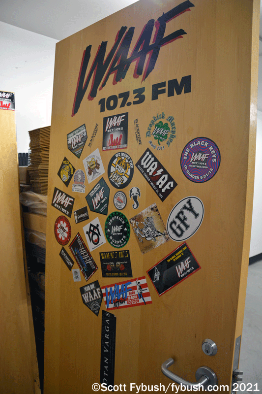 There’s one more relic out here of all the ownership turmoil: as Entercom moved out of its old studios in Brighton and into the former CBS Radio building down the road, its engineers salvaged a nice bit of Boston radio history and put it in storage out here. Under Entercom, the conservative talk of WRKO shared a roof with the wild active rockers down the hall at WAAF (107.3), and while WAAF is no more (it’s now EMF’s WKVB with K-Love), the old WAAF studio door lives on in a back room at Burlington.