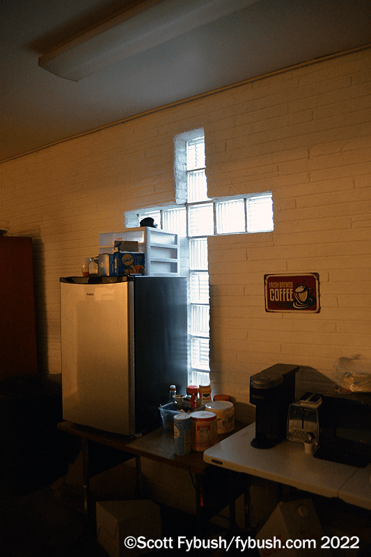 Its studio is just up the hill from the university, in a building that looks like it could have been built for radio studios back in the 1950s – but it’s not! It turns out this used to be a church, as evidenced by the glass-block cross in what’s now the office area in back, which was once the sanctuary.