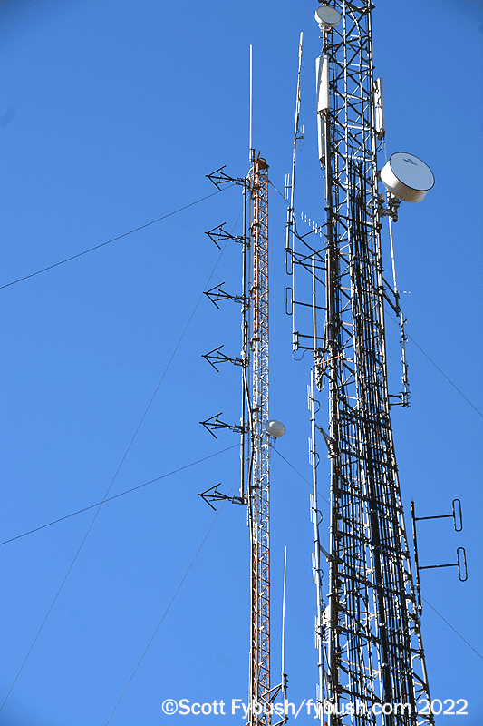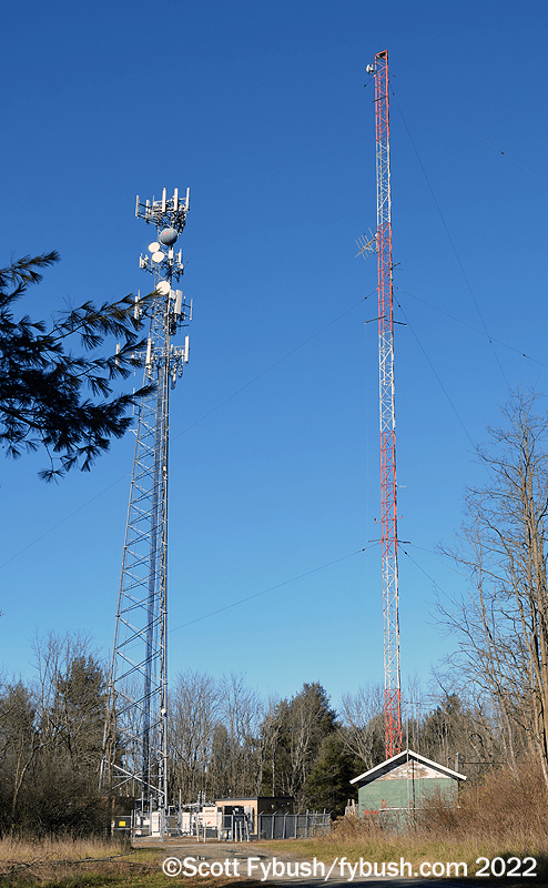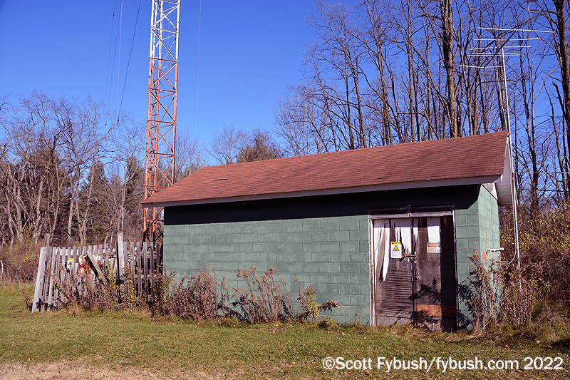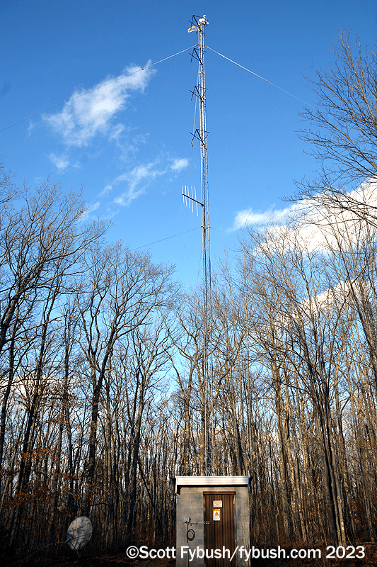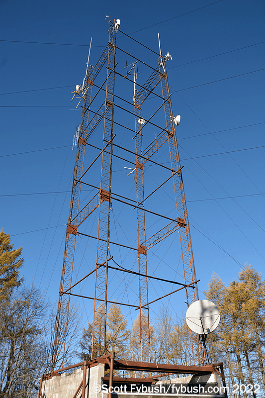 Continuing up the hill east of Mansfield on US 6, we turn north on PA 549 to make our way up to an old microwave tower that’s home to the market’s translators. From the top down, there’s a Pensacola Christian Church translator on 90.7, a Jimmy Swaggart translator on 91.5, and two Seven Mountains signals, a 97.9 repeating Elmira’s WNKI (Wink 106) and the 93.5 relaying WNDA.