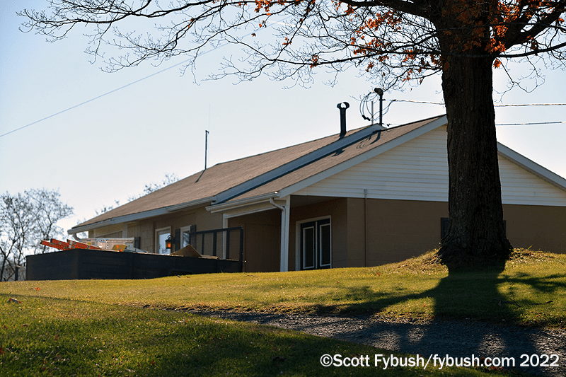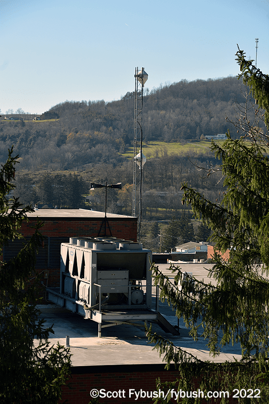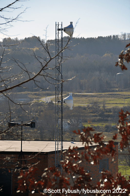 With a day to spare last fall, I got off 15 and took some time to see the sites of all the stations I hear as I’m driving through. It’s just a quick exit off 15 at US 6 in Mansfield to get to Mansfield University, home of college station WNTE (89.5), located atop one of the college’s hilltop buildings – but not all the way at the top of the hill, so we can actually drive up above the WNTE antenna to get a shot looking down at it and at the town beyond it.