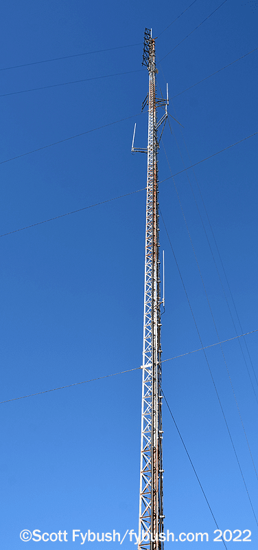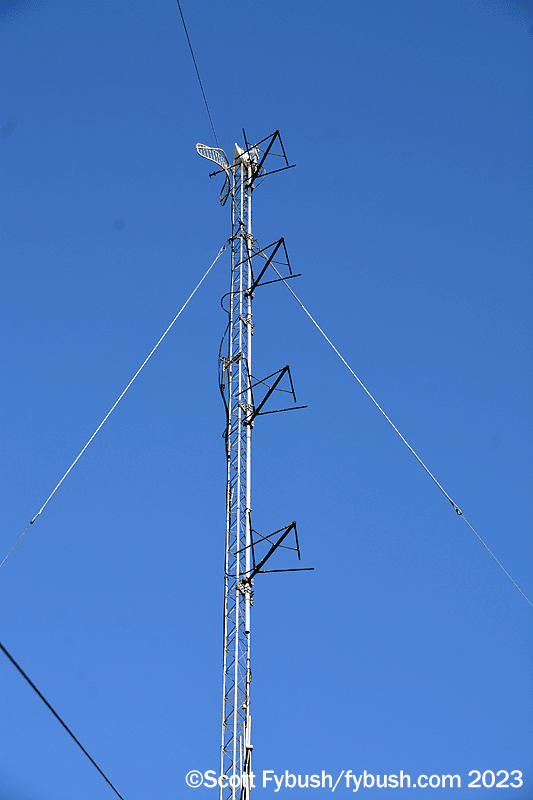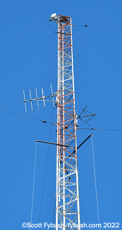 WNDA and its 93.1 translator broadcast the “WOGA” classic hits format from a hill next to the town’s Woodland Park, just southeast of downtown. Look closely at the tower and you’ll see a folded unipole antenna for the AM station, with a receive antenna for the main WOGA signal and the 93.1 translator antenna mounted up above that.