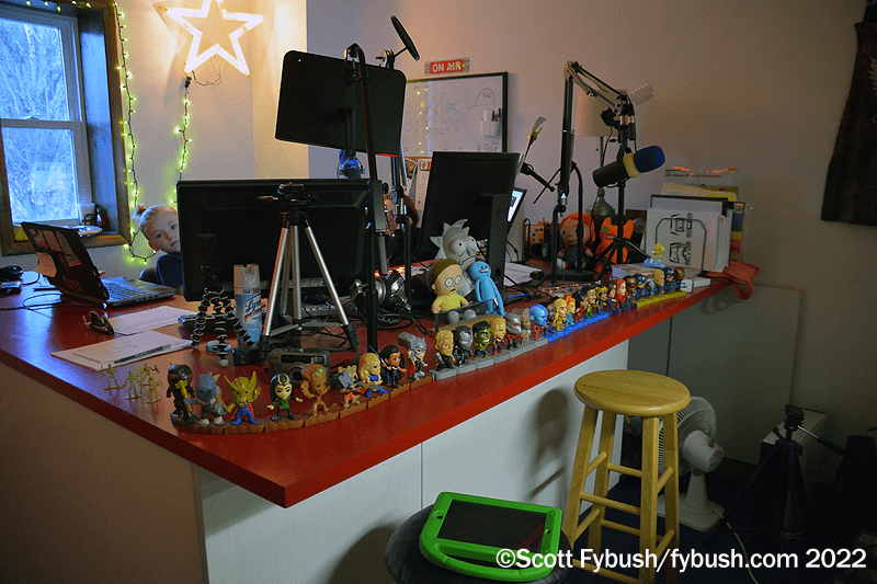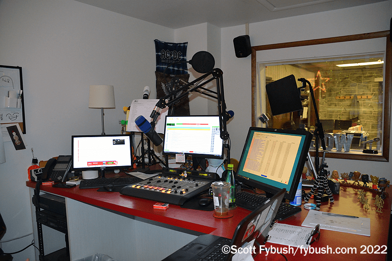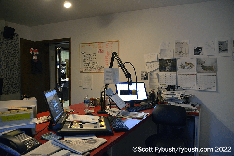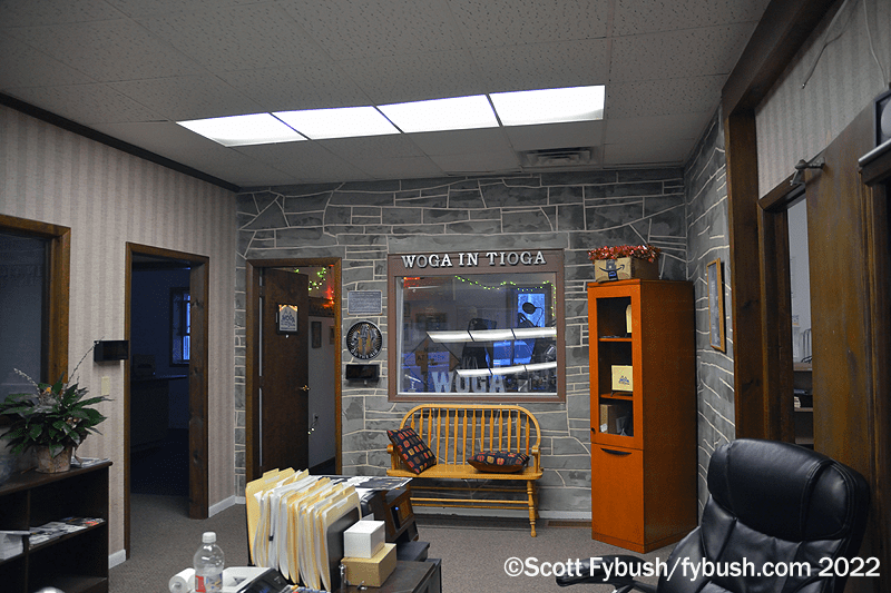 Next to that is the tchotchke-filled air studio for classic hits “WOGA in Tioga,” WOGA (92.3 Mansfield) and simulcast on WNDA (1490) there and on translators on 93.5 in Mansfield and 93.1 in Wellsboro.