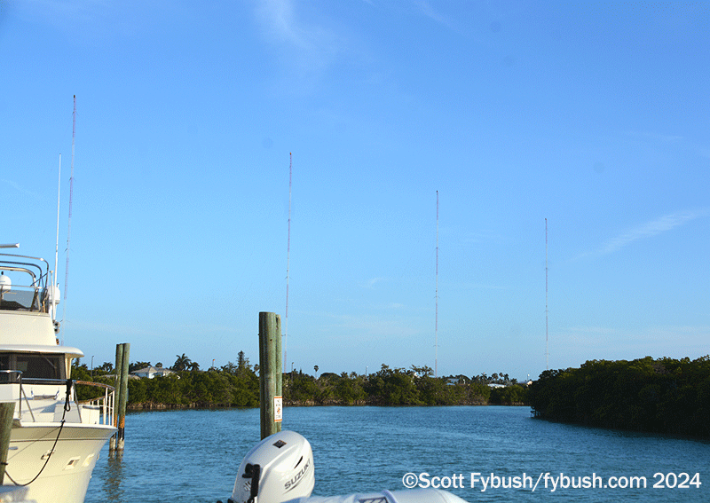 It’s actually pretty hard to get a completely clear view of these four towers these days, since the Sombrero area around the tower site is largely surrounded by waterfront housing developments and we didn’t want to go poking around in anyone’s backyards. We did, however, talk some nice folks having a late-afternoon beer on the deck of their boat to let us borrow their dock for a few minutes to get the photos shown here – and now we’re very, very glad indeed we made that trip, since who knows how quickly these towers might come down?