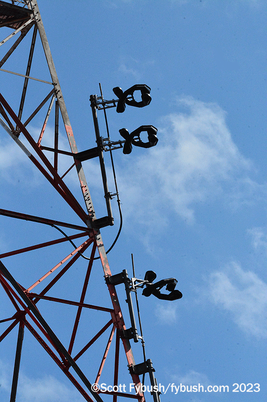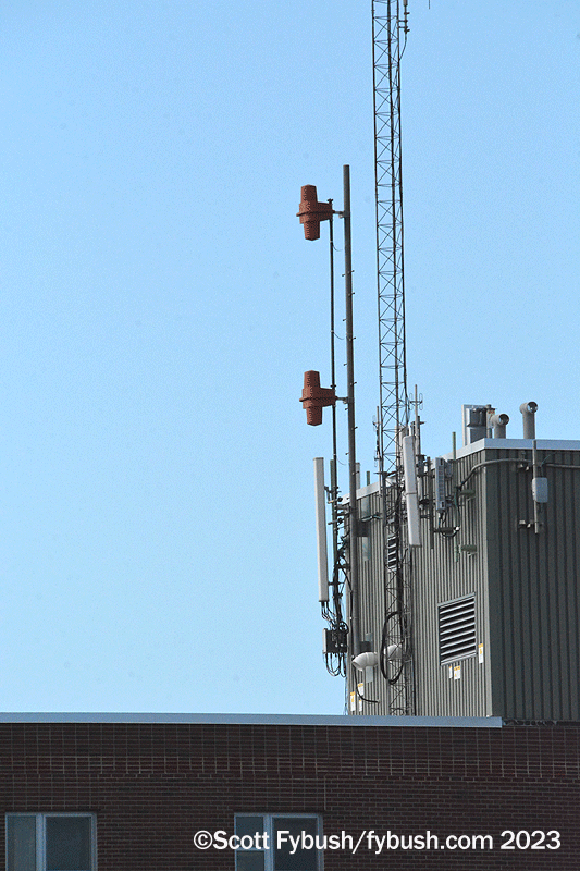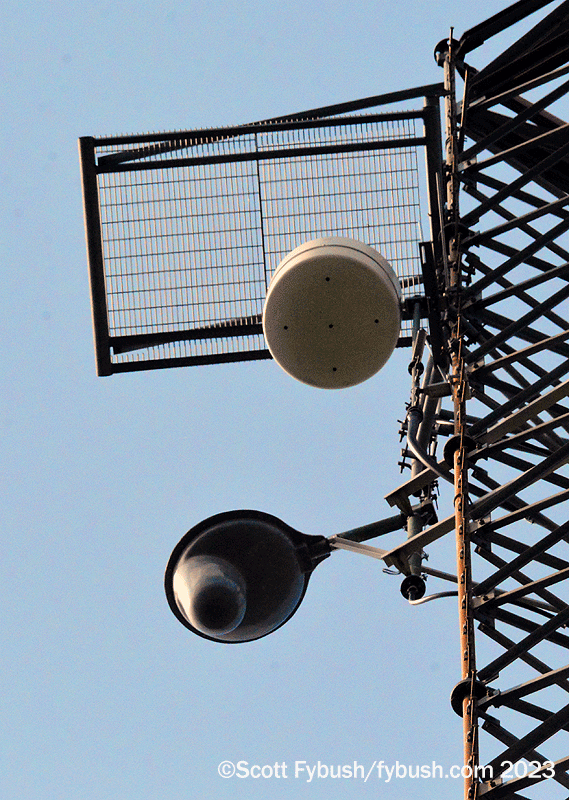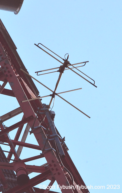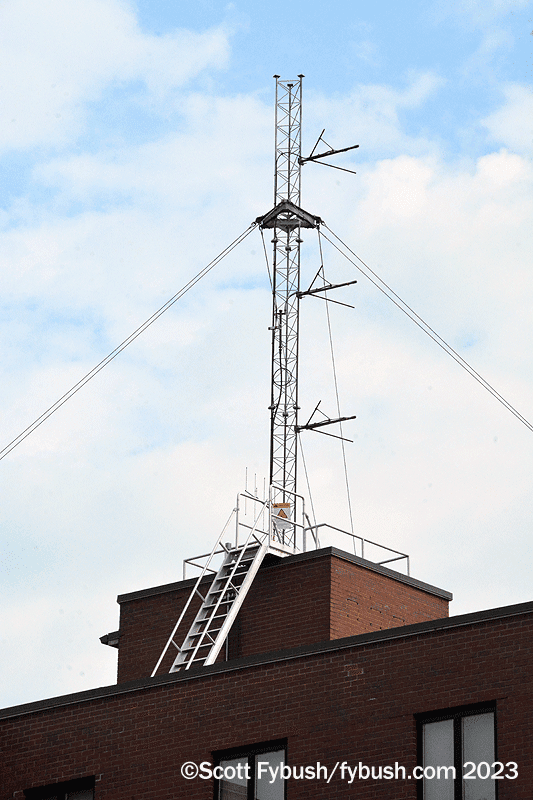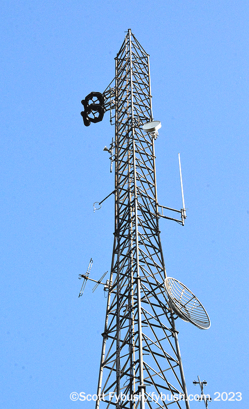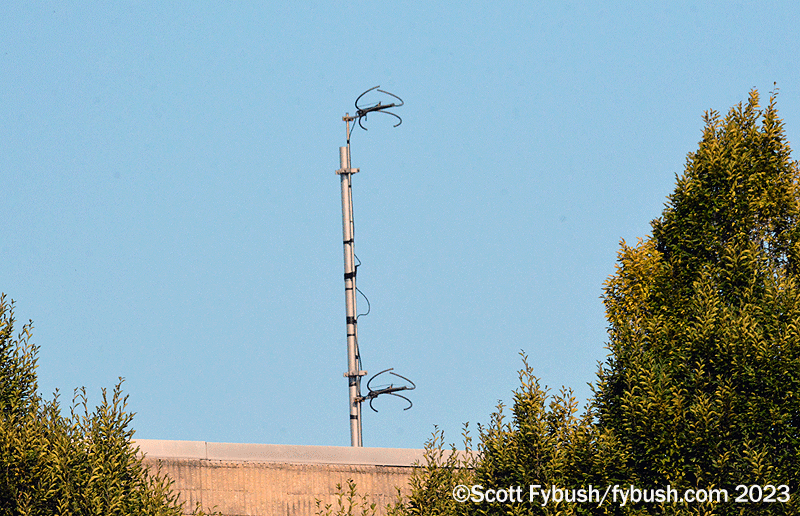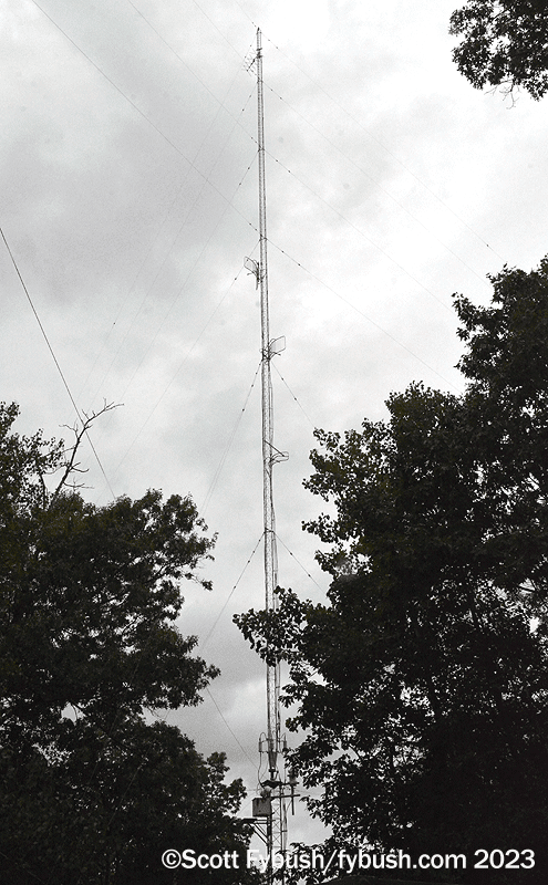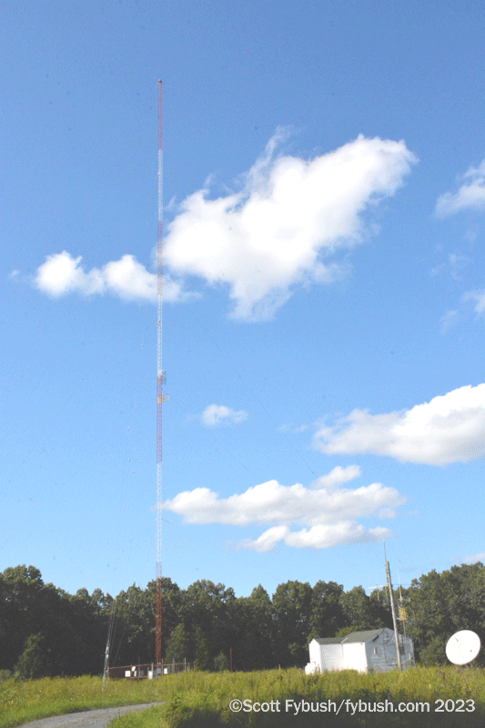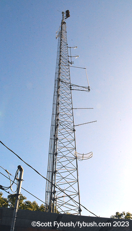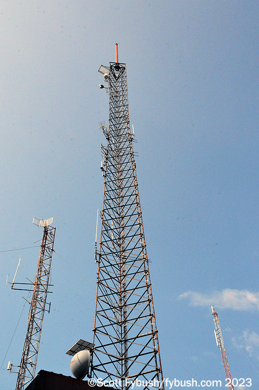 A little ways down from the top of the hill, another tower is shared by 104.9, now WWRR (“105 the River”) and as by Pax/ion affiliate WQPX (Channel 64), which hit the air up here in 1998.