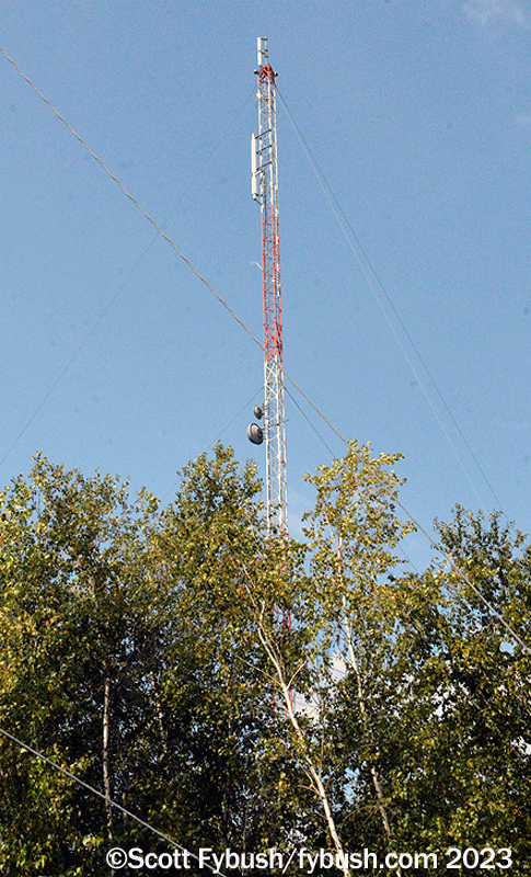 This former AT&T Long Lines tower is home to stations from both of the commercial broadcasters who serve nearby Stroudsburg and the Poconos: Seven Mountains Media’s WSBG (93.5 Stroudsburg) and Cumulus’ WWYY (107.1 Belvidere NJ) share that two-bay combined master antenna and the one-bay aux below it, while Seven Mountains’ 103.1 translator below relays “Poco 103” WVPO (840 Stroudsburg) – and from way up high on this ridge, almost 1500 feet above sea level, these class A and translator signals enjoy massively good coverage for what they are.