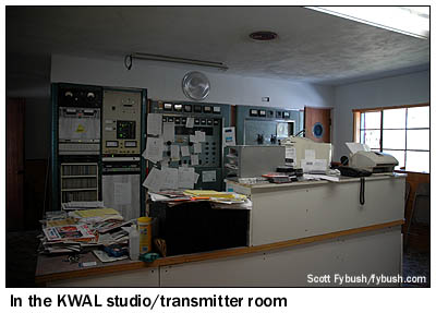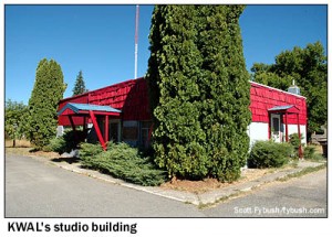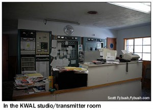 In this case, the radio station long predated the highway. KWAL was founded in 1939, calling itself “Silver Dollar Radio” after the silver mining that was the backbone of the economy in this mountainous region. Back then, it was a 250-watt Class IV signal on 1450, but in 1947 it was granted the move down the dial to its present facilities on 620. Inside the red and white building just off the highway in Osburn, theer are still vestiges of 1947 – the main air studio is elevated, and looks out through a big plate glass window into what’s now the front office of the station, but was once the live performance studio where local bands came to play. (There’s even an announce booth, just visible on the left side of the office picture.)