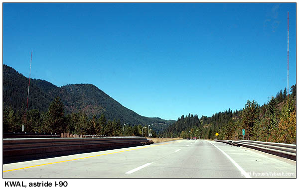 This is KWAL, Wallace, Idaho, and as far as we’re aware, this is the only place where an interstate crosses through an AM DA. (It’s one of only a few places where a major road of any kind passes through an array; other prominent examples include San Diego’s KFMB 760, where state highway 52 separates two towers from a third; WDAE 620 in Tampa, astride the Gandy Bridge; KTSA 550 in San Antonio, where busy Eisenhauer Road divides the array; and WPEN 950 in Philadelphia, where a city street separates two towers from a third.)