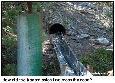 So the highway went about the only place it could go – right between towers one and two. There was supposed to be a culvert under the highway big enough to walk through, to make sure transmission lines could be repaired down the road if need be, but when we headed across the highway at the Osburn exit, then down the narrow frontage road that runs west to tower 2, we found what actually ended up getting built: a pipe about 2 feet across to carry transmission and sampling lines from the swamp behind the building under the highway and out to the tower north of the interstate. It’s quite a site, and quite a sight. (The view in the big picture is from the passenger seat on I-90 westbound; the studio and tower 1 are to the left, south of the highway, while tower 2 is to the right, north of the highway.)