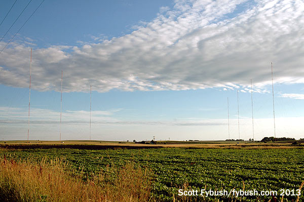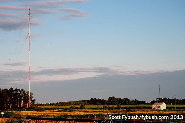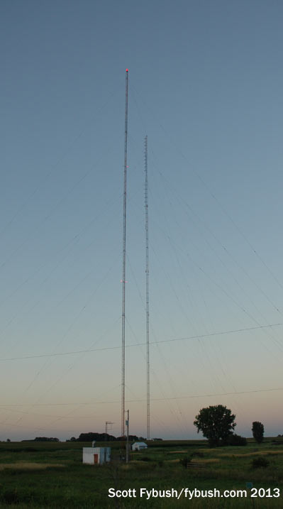 The Linder stations share a tower site off County Road 18 near Meridan, just south of the US 14 freeway between Owatonna and Waseca. The tower on the right in this twilight shot is KRUE’s (it runs 2500 watts by day and drops to just a few watts at night), while the two FMs share the taller tower at left.