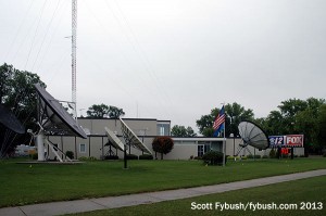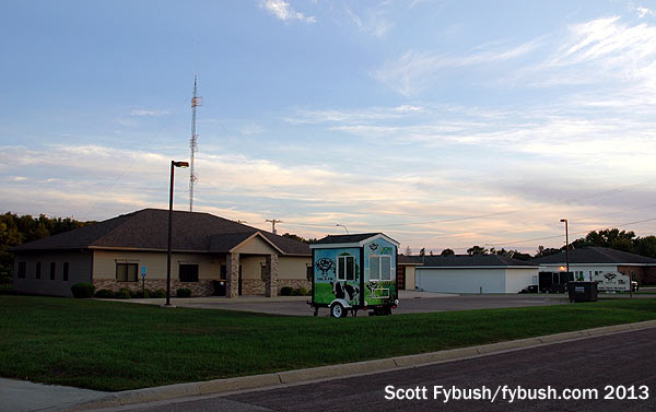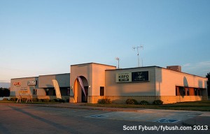 Instead, with daylight waning, we continued south on I-35 another dozen miles or so to Owatonna, where two studio clusters awaited us. Cumulus owned here, too, but has since sold to Townsquare, and its pair of stations – full-service KRFO (1390) and “Cat Country” KRFO-FM (104.9) share a tower site out east of town on Havana Road and a studio building near the Steele County fairgrounds on 18th Street SE.