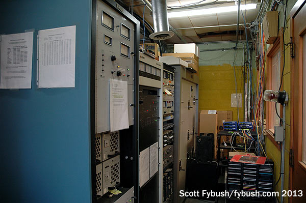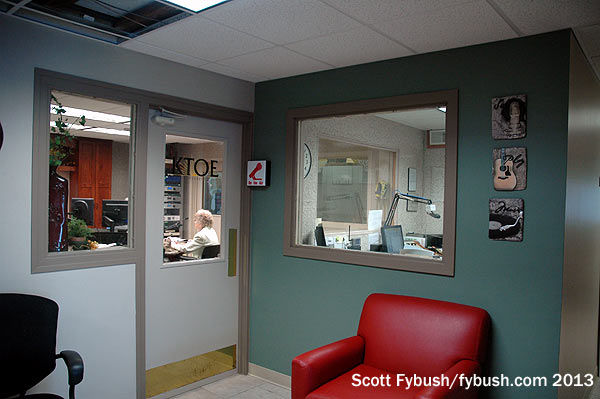 The 1230 studio, such as it is, doubles as the sports office for KTOE – and now that we’ve turned a corner in the hallway to get here, we’re in the original part of the building, over on the east end. The sports studio is one of several studios that looks into the spacious main studio for KTOE, one of the more comfortable radio spaces we’ve ever seen. Some clever trade-outs with local businesses yielded that nifty granite countertop and the cabinetry that makes one end of the studio look more like a nice executive office. And this space gets used, a lot: KTOE’s talk format (now augmented by a translator at 102.7) is heavily local and live. It’s truly the picture-perfect small-market station – complete with the window behind the air talent that looks right into the transmitter room, where KTOE’s Nautel and KYSM’s Harris keep each other company next to the KTOE phasor.