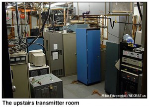 “Kix 97.9” started out from a transmitter in a corner of the upstairs room (you can see the equipment rack at the right side of the photo of the room above), but in recent years has moved into a new space of its own downstairs, just off the old newsroom. It won’t be there long, though, since Clear Channel is working to move the 97.9 facility south into the Hartford market.
