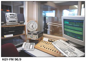 Down the hall from the air studio, there’s a newsroom, a production room, and the studio for KGY’s more recent FM sister, KGY-FM (96.9 McCleary), which was running mostly from a satellite service, but had a local morning show that uses this little room.