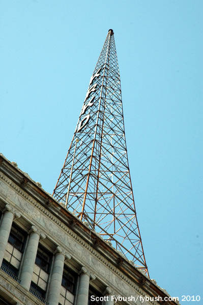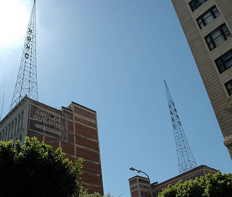 Amazingly, KRKD only operated from the twin towers atop the Spring Arcade Building for a few years. By the mid-1930s, Hilliker notes that KRKD had relocated its transmitter to the Angelus Temple in Echo Park, where it was able to boost power from 500 watts to 2500 watts, on the way to a 5000-watt power level from Montecito Heights in 1948. But the short-lived Spring Arcade towers stayed in place after KRKD left, and they”ve been there ever since, proudly proclaiming a callsign that hasn”t been heard in Los Angeles since the early 1970s.
